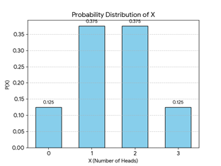 b. Three coins are tossed. If X denotes the number of heads, then find the probability distribution of X. Calculate the mean, variance, and graph of the probability distribution.